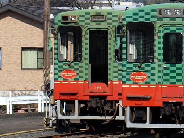 老朽化が顕著なモオカ63形の置換え用として登場した車両。 形式の「14」は平成14年に登場したことに因む。 モオカ14-1・2 2002年1月20日にワンマン運用で運転開始。 前面窓には3枚窓を採用。 前面貫通扉上に前照灯・尾灯、前面窓両側にワンマン運転用のサイドミラーを装備。 車体は富士重工業のLE-DCの仕様を踏襲した前面貫通扉付・18m級2扉の普通鋼製。 塗装は、濃淡の緑モザイク模様で、前面および側窓下が橙色、橙色塗装上部に白細帯。 走行用機関として小松製作所製のディーゼルエンジンSA6D125-1-1(355ps)を1基搭載。 台車はFU56D/T。暖房はエンジンの冷却水を利用。 この2台にはJR線乗り入れに備えATS-Pが搭載されている。 落成直後は前面下部のステップが簡易な鉄棒→現在は上部に別のステップが取り付け。 モオカ14-3・4 2002年5月に富士重工業が鉄道車両事業から撤退→製造メーカーを日本車輌製造に変更。 2003(平成15)年に設計が変更され運転開始。 モオカ14-3以降は、前照灯・標識灯が前面窓上両側に設置。 貫通窓上には「ワンマン」のステッカー。 2013(平成25)年11月現在9両が在籍し、真岡線下館駅 - 茂木駅間の全線で運用。 |