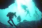 ドロップオフをどんどん進む。前方に穴!!。ここから入るの?、大分狭そう・・・。それじゃ、みんなライト出して。さあ、一人ずつ並んで、並んで!。突入!!、真っ暗。”狭いよ〜、暗いよ〜、・・・・”、騒いで(?)いるうちに、広場に到着。どの辺りが別荘?、もしかしてこの辺?。管理人は、アカマツカサにリュウキュウハタンポ。居候もいる、テリエビスとか・・・。水深は?、げっ、35m!。い、いつの間に!。他人の家(?)に、長居は禁物、早々にお暇しましょう。そそくさと出口へ。前方がうっすら明るい、もうすぐ出口?。後少し、目も眩む明るさ!。一斉に光の中へ、復活!!。この辺りはハナゴンベの縄張りのはず。でもスポットライトは嫌いみたい・・・。ここからオーバーハングの下をくぐって、徐々に浅瀬へ。最後はボートの下で自由時間。しばしウミウシやコマチコシオリエビなどの鑑賞会。一人、二人と減って行き、最後に残ったのはYukiちゃんと僕だけ。それじゃそろそろ浮上します。ちょっとロープが混雑中。Yukiちゃんはロープ無しの安全停止。お見事、上達したね!!。