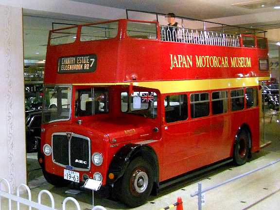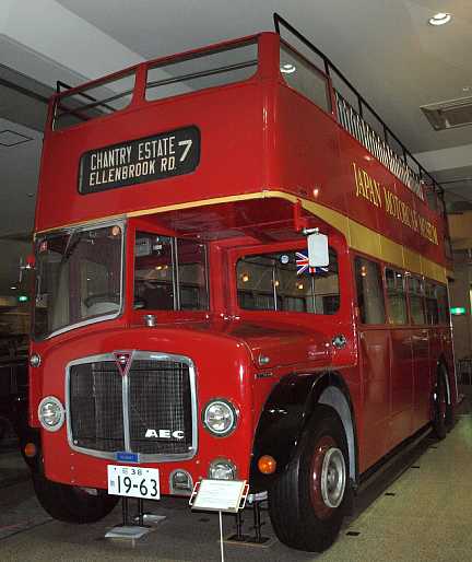 シャーシ:LEYLAND MOTORS ロンドンバスの名物”2階建て赤バス”こと、ダブルデッカー(2床)フロントエンジン片運転台の低床式シャーシで、座席65人(立席別)乗り。特に展示車は、霧の街ロンドンにおいて非常に貴重なオープンボディー。1970年からは同じ全長で同じ乗客収容力を持つシングルデッカーの出現でダブルデッカーは終了。 展示車は、レイランドシャシーのRM5/7タイプやRTLタイプに似ているが、オープンタイプは何処にもデータが見当たらない。 上記は展示車に表示されていた内容であるが、ネット上ではAEC社(Associated Equipment Company)の”Routemaster”にあたると思われる。1959年に生産を開始、1968年までに2,876台が製造され、2,760台がロンドン市内で運行された。エンジンを前方に置き後輪を駆動するFRレイアウトを採用したため、後部に出入口を置くワンステップ構造を実現、パワーステアリングや前輪独立懸架、アルミニウム合金製の車体など、当時としては先進的な装備が施されていたという。