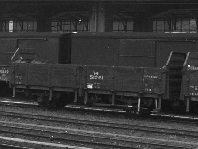国鉄トラ45000形貨車は、日本国有鉄道(国鉄)が制作した貨車(無蓋車)。 1960(昭和35)年-1963(昭和38)年に、8,184両(トラ45000-トラ53183)が製作。 妻面や床板に鋼板を用いた半鋼製車の二軸無蓋車。 妻面はプレス鋼板、側面の「あおり戸」のみ木製。外部塗色は黒色。 懸架装置は二段リンク式で、最高速度は75km/h。 荷重は17tだが、嵩高貨物の積載時には15t。この運用方を識別するため、車体表示記番号は符号”コ”を前置。 |