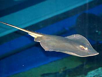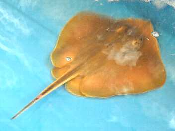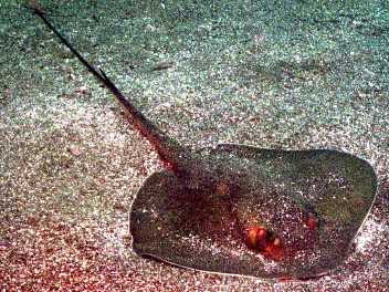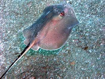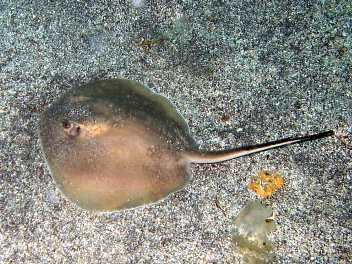体長50cm。体盤背面は褐色、眼球及び噴水孔周辺は黄縁取。体盤腹面は淡色で黄色斑が散在、縁辺には黄縁取。体盤は菱形。吻は三角形に突出、体盤前縁はほぼ直線。全長は体盤幅の約2倍。索餌以外の時は海底で砂に潜り、眼と噴水孔を出し、尾部を斜め上方に立ててじっとしていることが多いらしい。アカマンタ(沖縄)。 |