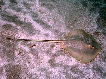 イズヒメエイとの区別は、尾部腹面の皮褶が黒色なのが一番確実に見分けられるらしい。 |