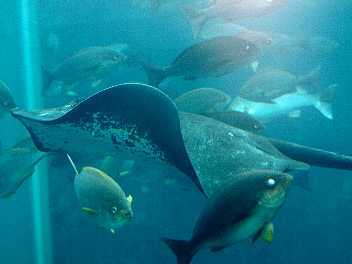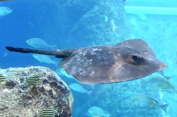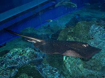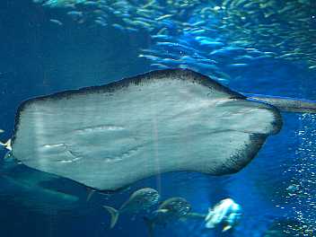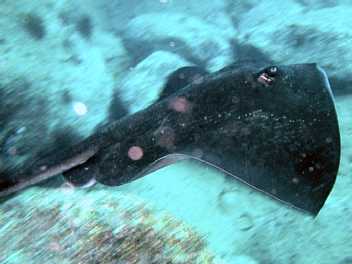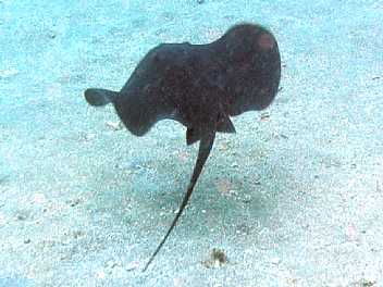 全体に灰黒色で、吻先端の突起・体盤背面の白色点などの特徴が見られる。体盤幅は6~70cmと小さく、体盤背面の棘も見られないため、まだ若魚で、浅瀬に居たと思われる。 |