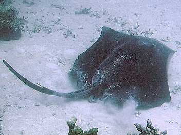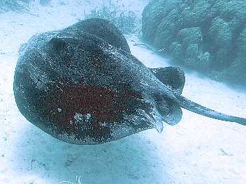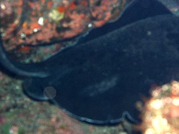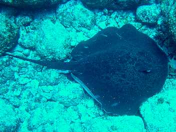 体長3.3m,体盤幅2m,150kg。体盤は円形。体盤背面は灰色、眼径より大きな黒斑が分布。体盤腹面は灰白色、濃灰色の縁取り。尾部背面に隆起線や皮褶がない。尾部腹面の皮褶は高く、尾端まで達する。