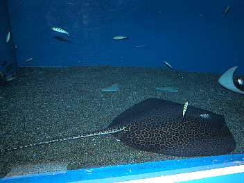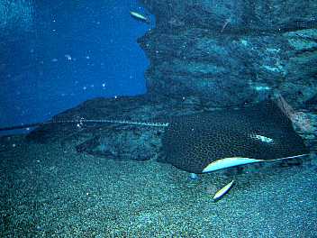 体盤幅1.8m(2.2m)。体盤背面に中央が淡色の多角形紋様(ヒョウモン)が密に分布。尾部背腹両面に隆起線や皮褶がない。