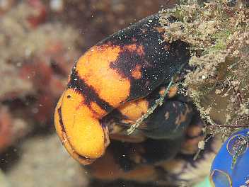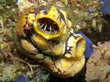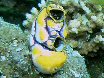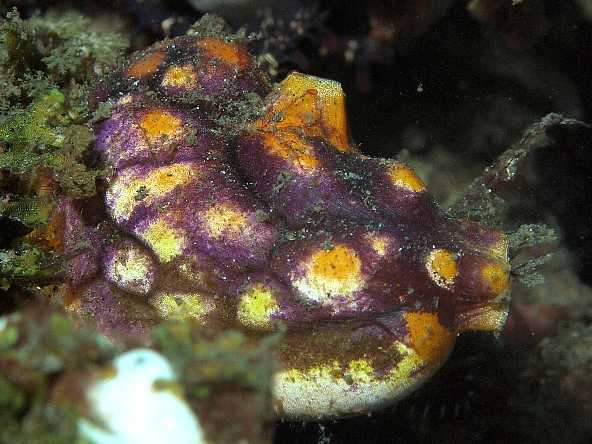 体高10cm。単体性。入水口、出水口ともに大きく開く。地は紫色。入水口、出水口の周囲、及び突出する部分は黄色。表面はなめらか。
